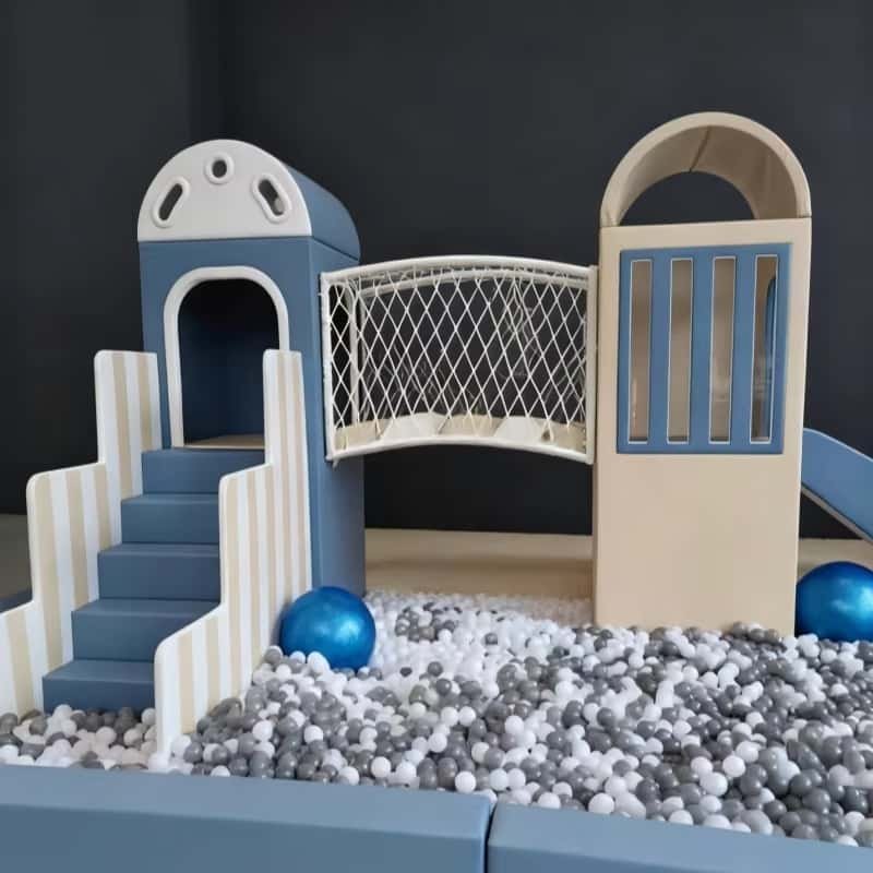 Cloudscape Blue 1~6 Years Kids Indoor Playground Castle Climber with Ball Pit Soft Play crée un environnement de jeu intérieur sûr, amusant et imaginatif pour les enfants. La palette de couleurs douces et apaisantes (bleu, blanc et beige) associe un design élégant à des avantages multifonctionnels pour le développement. Il est parfait pour les cafés, les centres commerciaux, les écoles, les crèches ou les aires de jeux intérieures familiales.