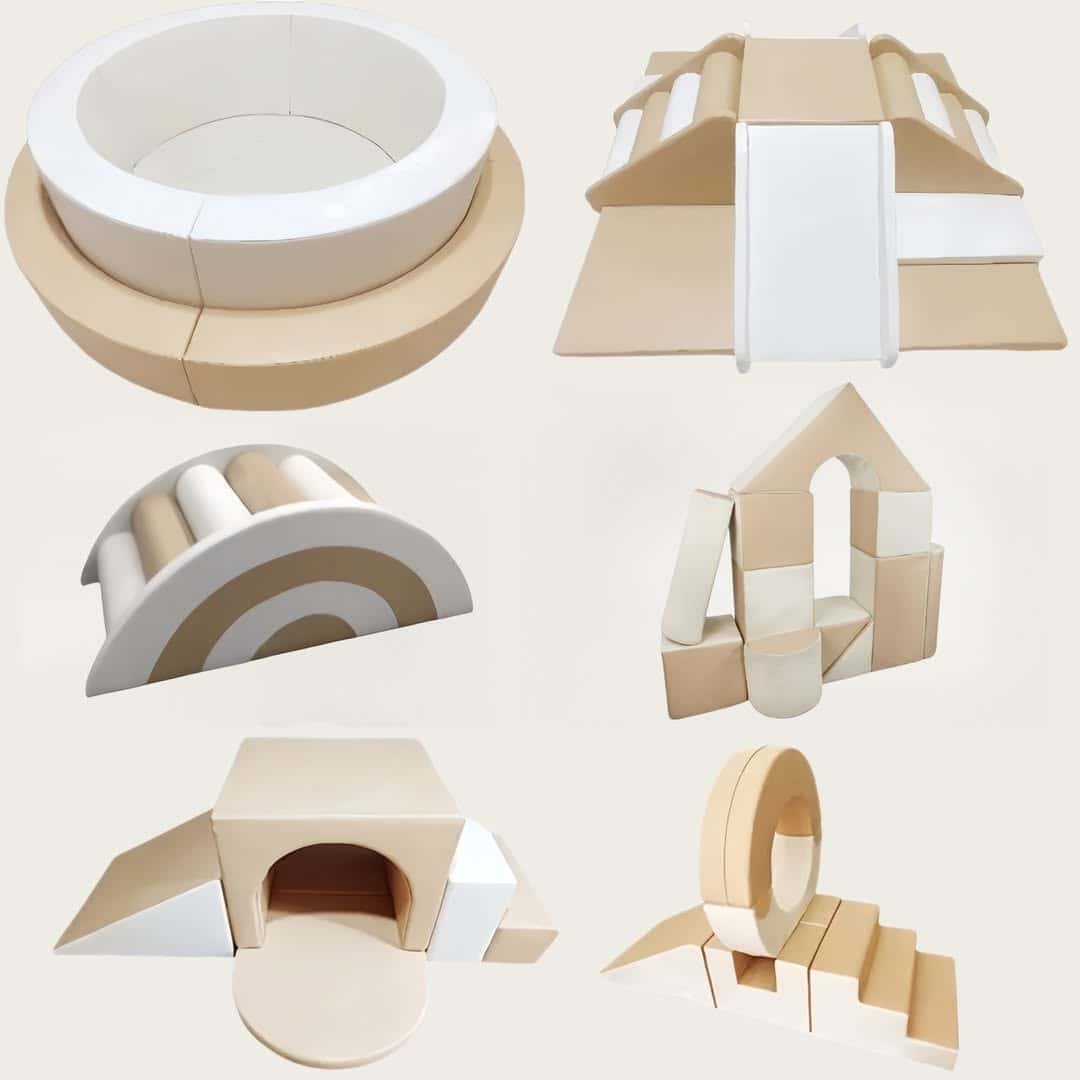La palette di colori neutri rende questo soft play beige design ideale per allestimenti estetici, minimalisti e a tema.