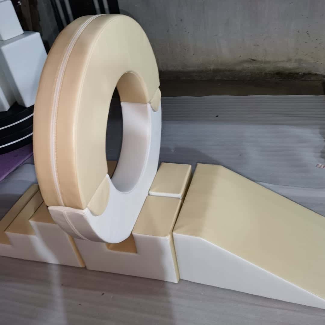 耐久性のあるPUレザーに包まれたベージュのソフト遊具は、防水性、耐摩耗性に優れ、お手入れも簡単です。.